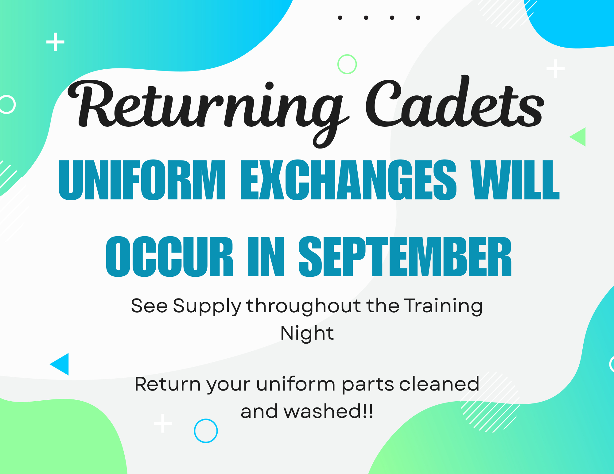 Uniforms are provided at no charge. Cadets are responsible for care, cleaning and custody of the issued kit and also to return it when ceasing to be a cadet.